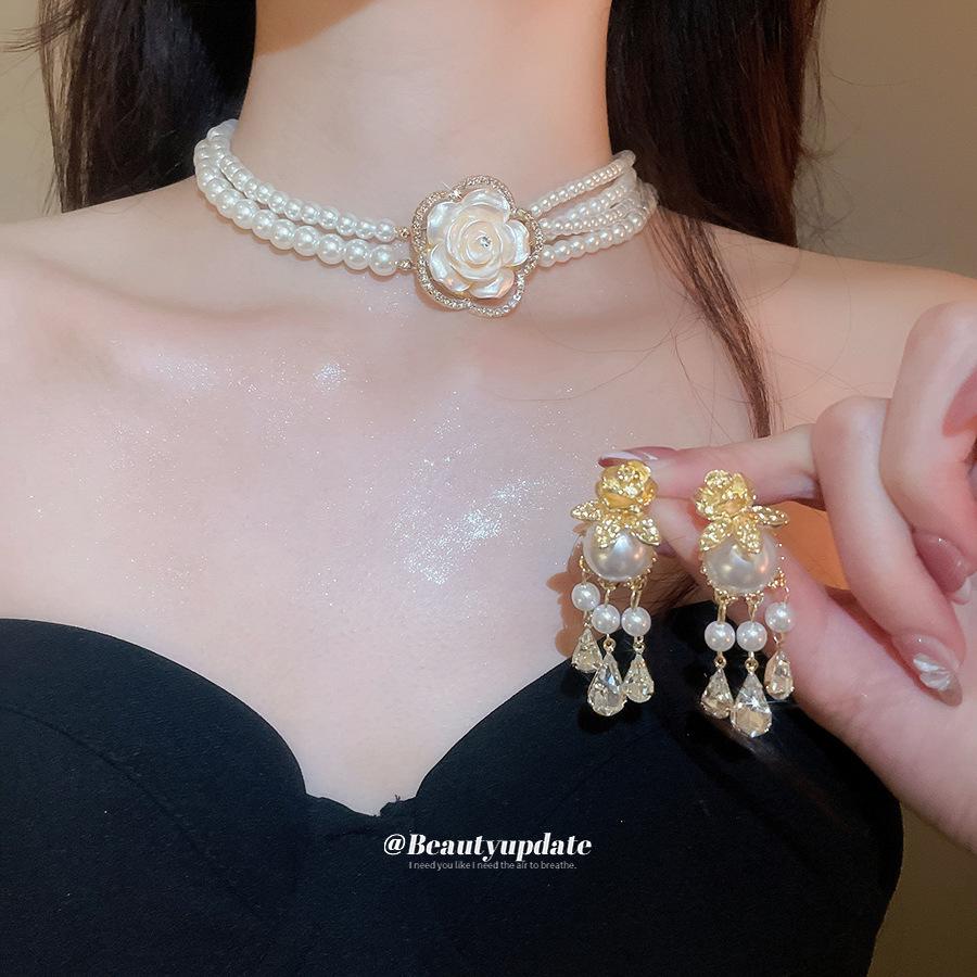 Elegant Retro Multi-layered Necklace with Rhinestones, Resin Pearls, and Beaded Flowers for Women