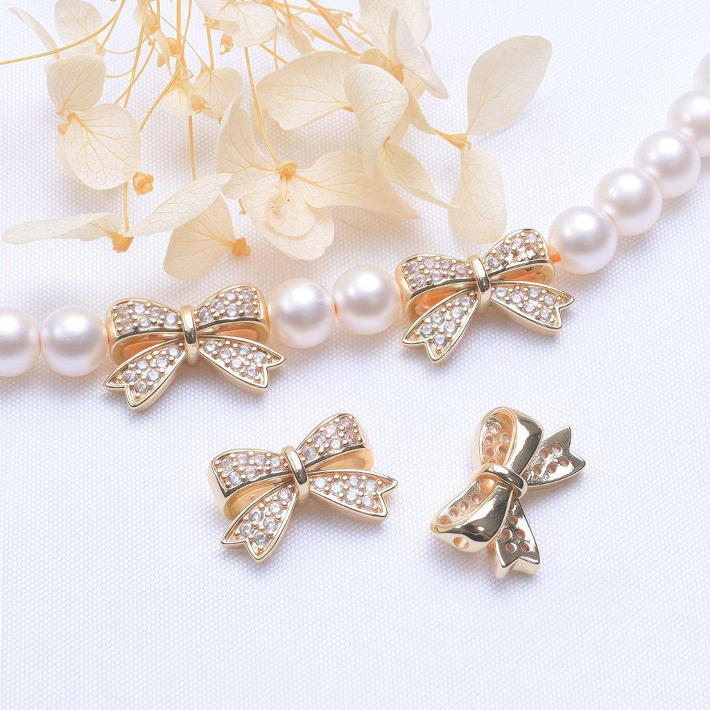 14K Gold Plated Zircon Spacer Beads, Bow Tie, Through Hole, Loose Beads for DIY Handmade Bracelets