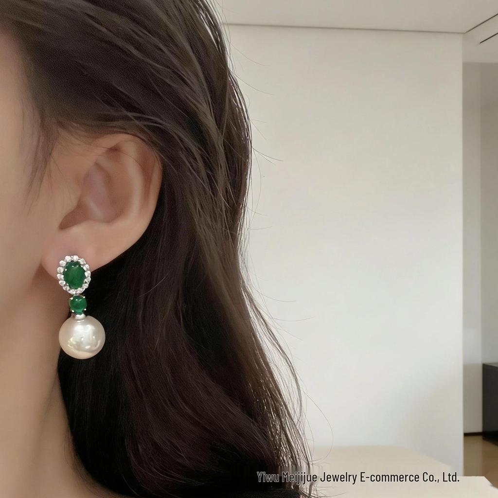 Elegant Emerald Green Zirconia and Pearl Stud Earrings - Niche Design for Beautiful Ladies