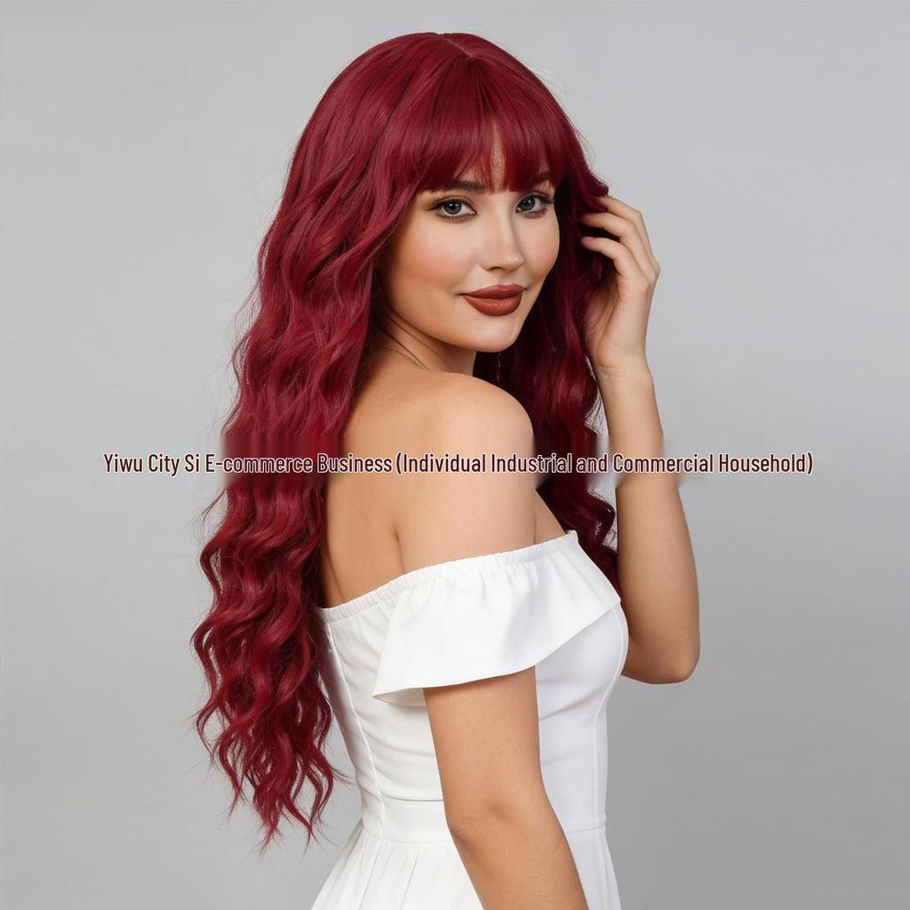 Wine Red Long Curly Wig with Full Bangs and Straight Ends - New Style