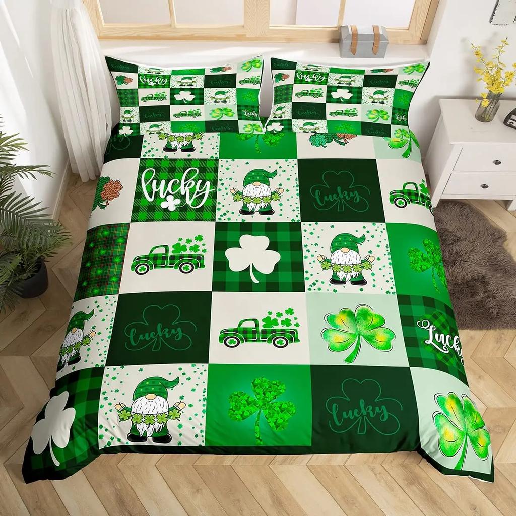 St. Patrick'S Day King Full Duvet Cover Green Lucky Clover Bedding Set Happy Cartoon Gnome Quilt Cover Polyester Comforter Cover