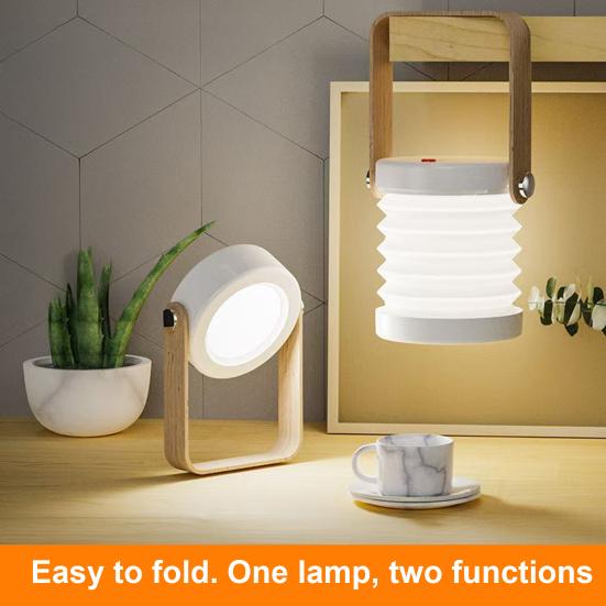 Innovative Foldable Design with Wooden Handle: Showcases a unique style combining a wide wooden-textured handle and a foldable lampshade. Easily switch between a vertical desk lamp and a portable handheld lantern. This versatile design enhances usability while adding aesthetic appeal to any space.