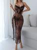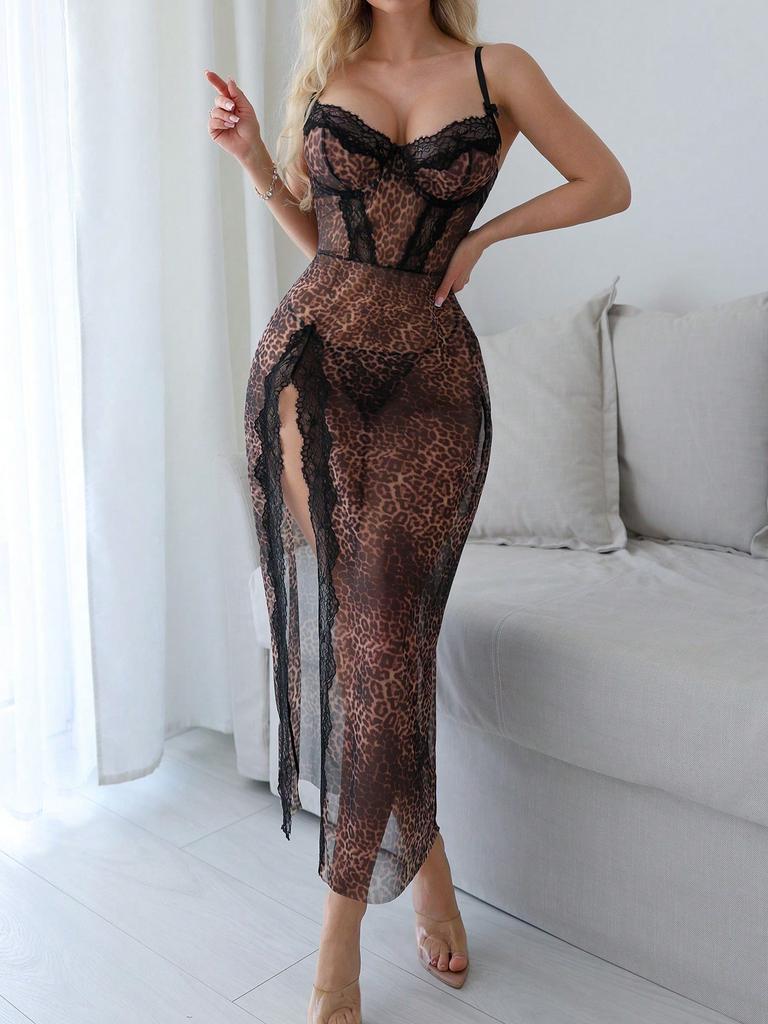 Women’s Long Lace Leopard Print Camisole Nightgown High Slit Spaghetti Strap Lingerie Sleep Dress