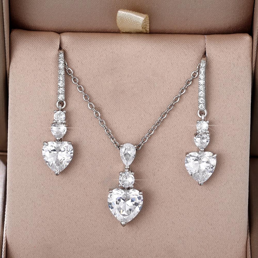 Fashion Silver Color Love Heart Necklace Earrings Cubic Zirconia Set Elegant Stamp Women Wedding Set