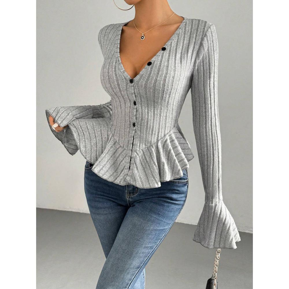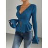 Women's Elegant Style T-Shirt Autumn Winter New V-Neck Ruffle Slim Fit Temperament Fleece Top