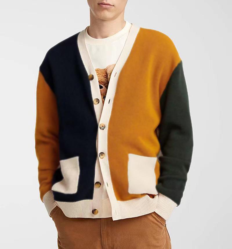This slim-fit men's knit cardigan is perfect for spring and autumn wear, offering style and comfort. Featuring a V-neck design and long sleeves, it's crafted from a lightweight, thin material that ensures breathability. The cardigan is made from high-quality artificial silk material, providing a luxurious feel, while the ice silk used for the fur adds a touch of elegance. Ideal for casual outings, this color block cardigan enhances any outfit with its modern and sleek look.