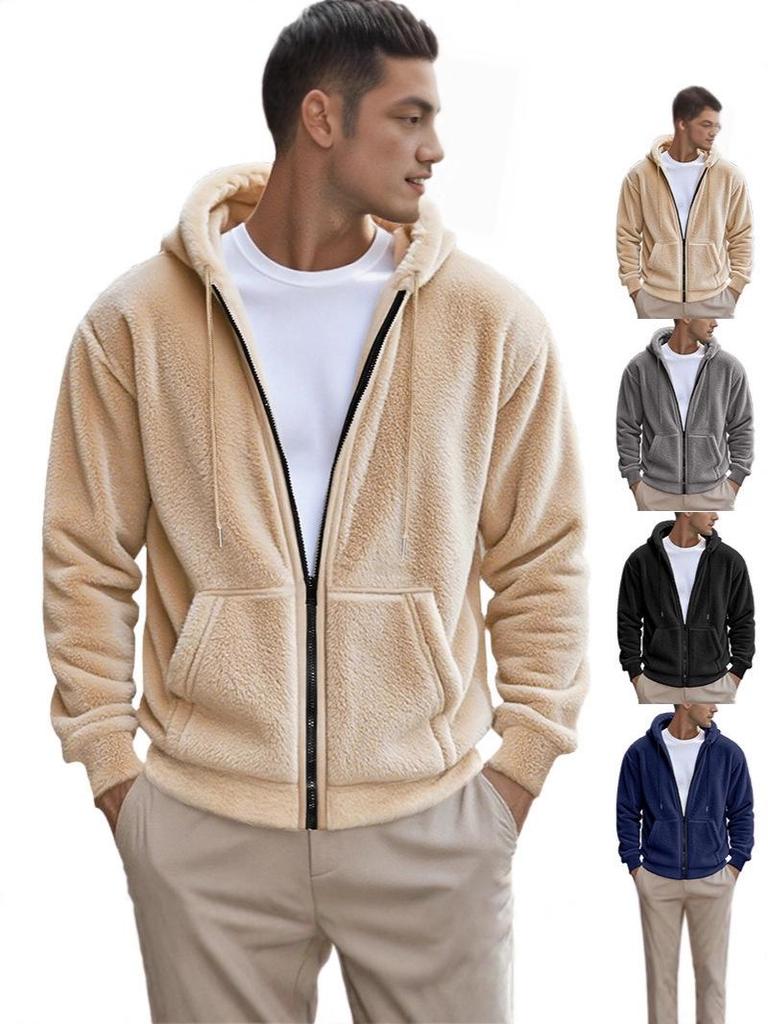 Introducing a versatile and stylish outerwear option perfect for the cooler months, this men's hooded jacket combines comfort and functionality. Crafted from durable polyester with an insulated thickness, it ensures warmth and coziness throughout autumn and winter. The jacket features a stand neckline and a solid pattern, making it a timeless addition to any casual wardrobe. Its long sleeves and double-sided fleece design offer extra insulation, while the loose fit and convenient zipper closure provide ease of wear. The jacket is lined with a chemical fiber-blended fur material, enhancing its soft feel. Ideal for casual outings, this sweatshirt-style jacket seamlessly blends warmth and contemporary American style.