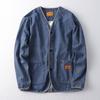 This men's jacket boasts a blend of trendy Japanese retro style and practical design. Crafted from medium-thickness washed cotton denim, it offers a comfortable and durable outerwear choice for any season. The jacket features a stand neckline and a solid pattern, providing a sleek and modern look. With a collarless and long sleeve workwear style, it adds a touch of sophistication and versatility to any wardrobe. Ideal for those seeking a balance between classic and contemporary fashion, this denim jacket is perfect for everyday wear.