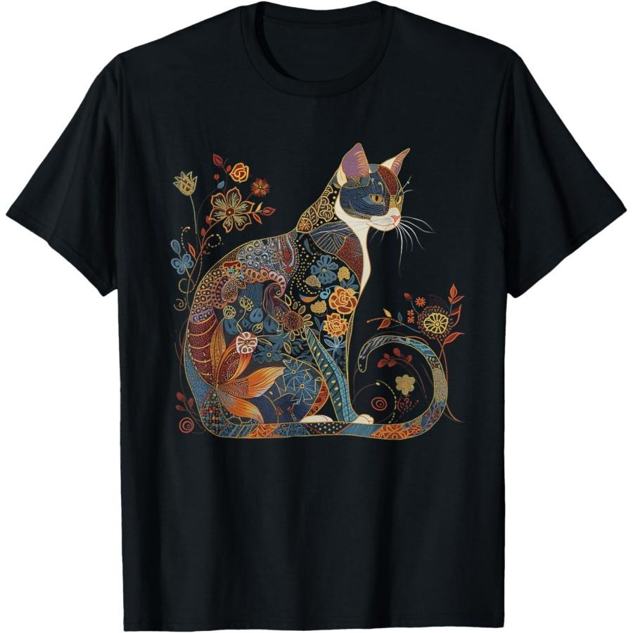 Cat Colorful Floral Patterns Vintage Flowers Art Cat Lover T-Shirt