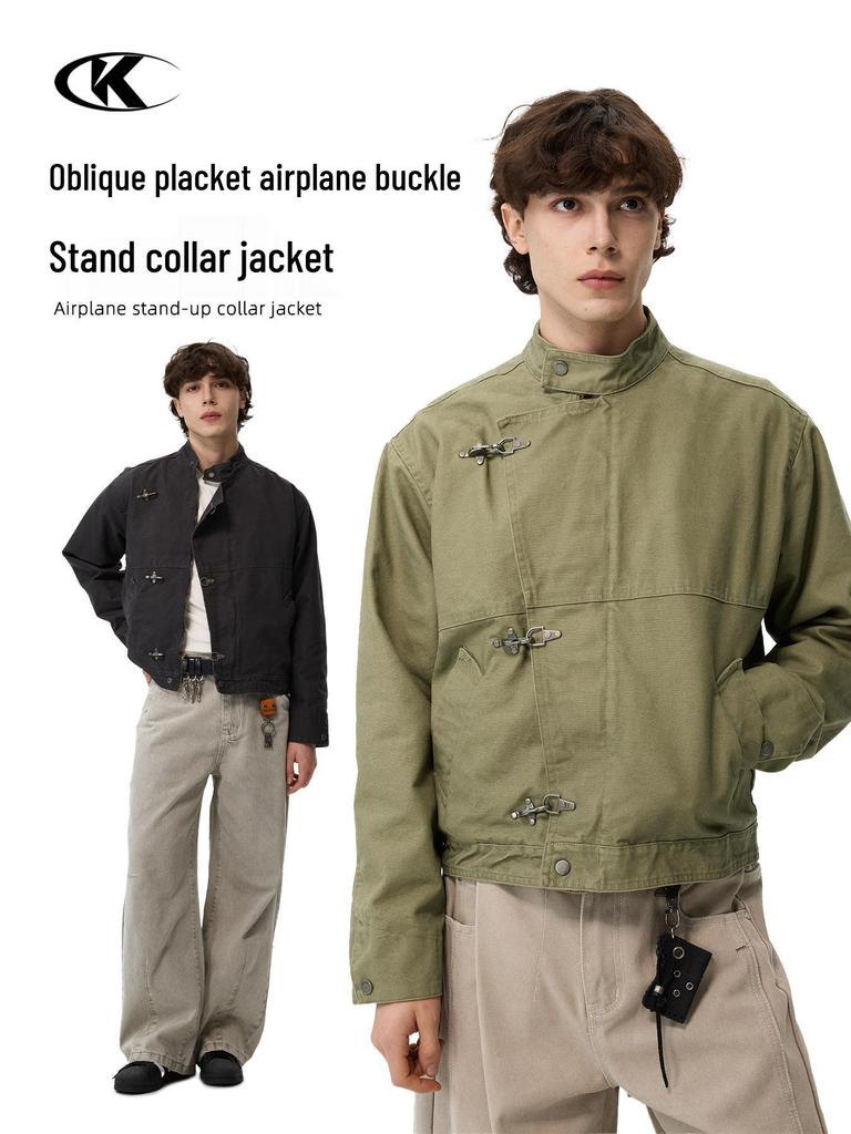 Introducing a versatile and stylish addition to your wardrobe, this unisex retro-distressed workwear jacket combines classic design with modern touches. The jacket features a wide lapel and a distinctive airplane buckle for a unique, standout look. Made from medium-thickness, solid-patterned cotton, this jacket provides just the right amount of warmth and comfort. With a stand neckline and long sleeves, it's perfect for layering in cooler weather while offering a sleek, polished appearance. Ideal for both casual and semi-formal occasions, this jacket is a timeless piece that effortlessly blends rugged charm with contemporary style.