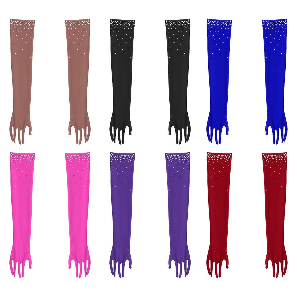 Girls Five Finger Mesh Gloves Glittery Rhinestones Design Full Length Latin Dance Performance Accessories