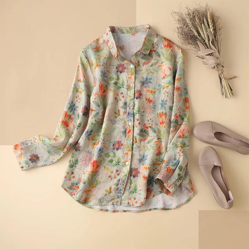 Women's Spring Linen Print Shirt Floral Vintage Causal Long-Sleeve Blouse