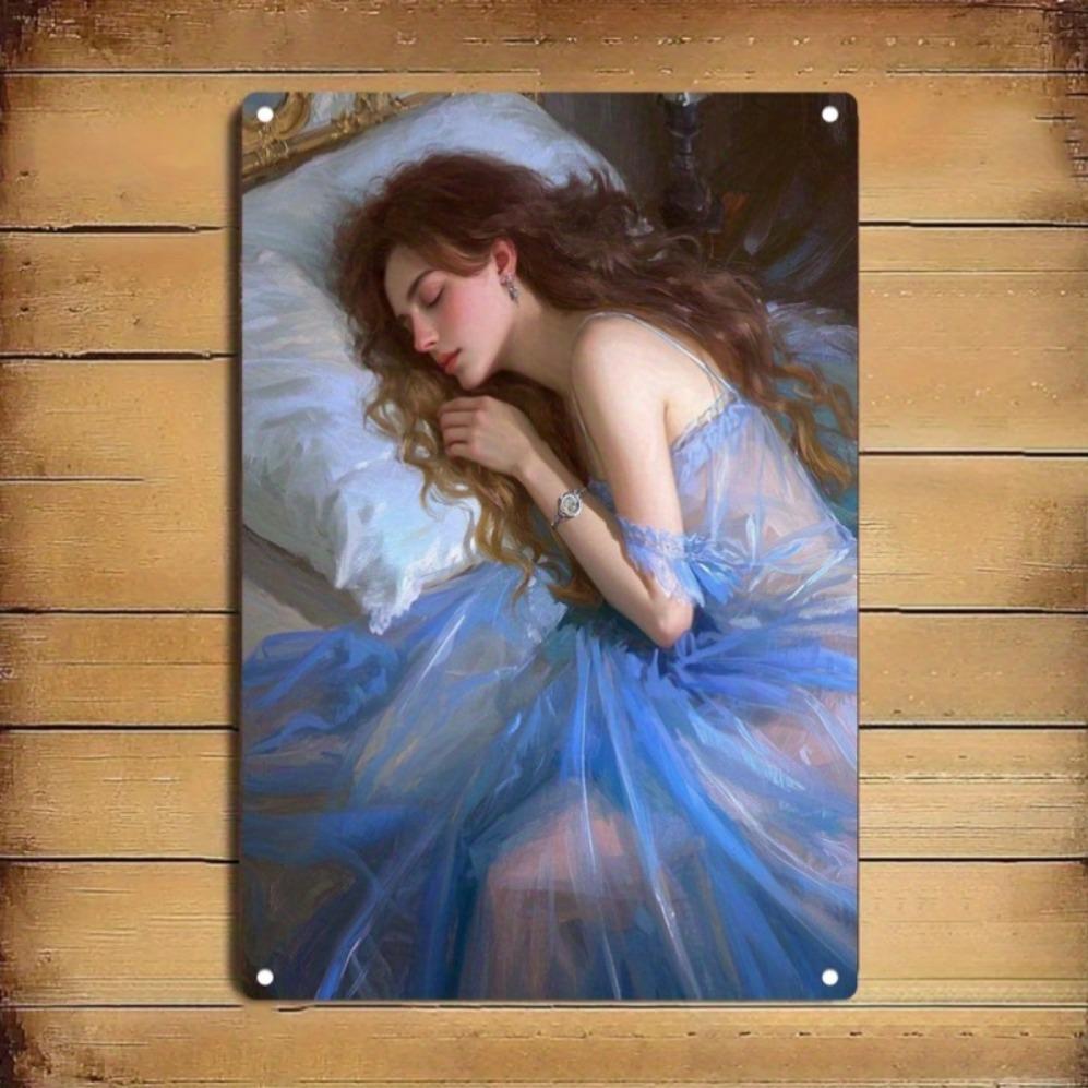 Elegant Sleeping Beauty Metal Wall Art Vintage Iron Sign with Blue Dress Gold Accents for Home Cafe Bar Bedroom Wall D