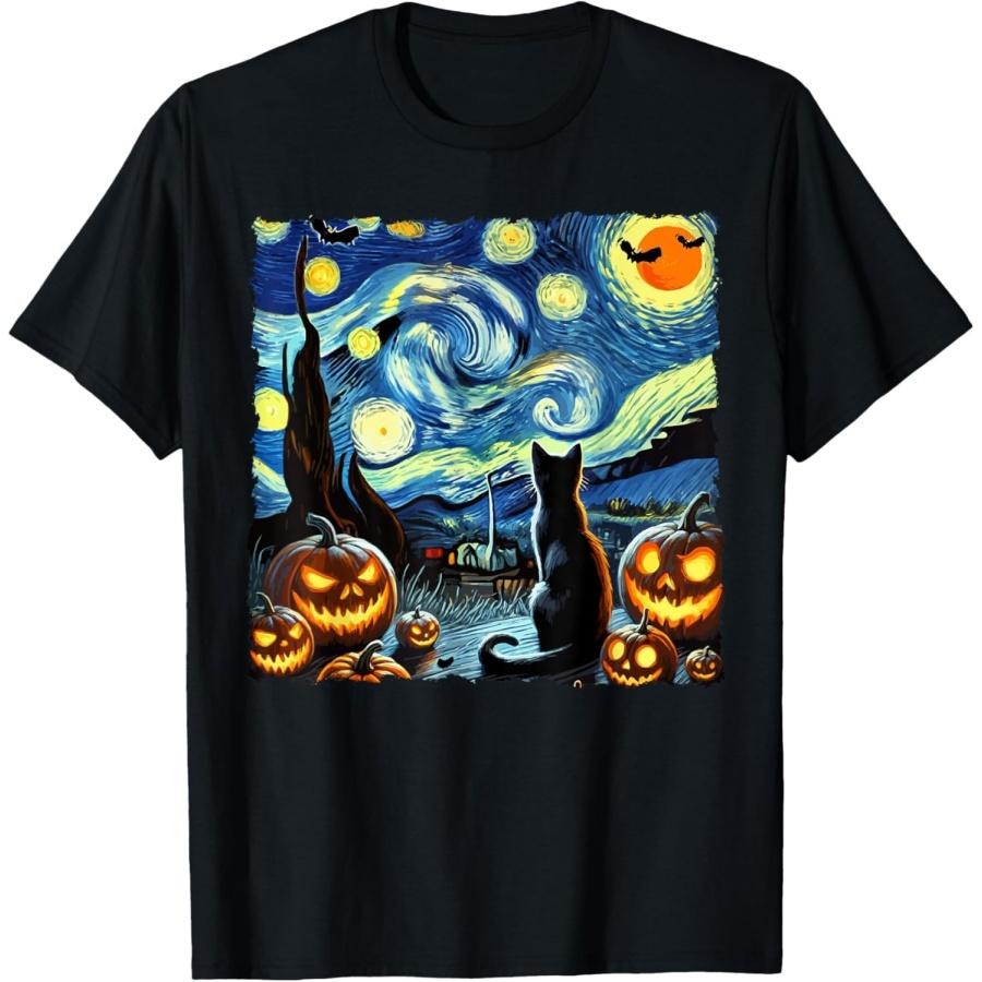 Figured Halloween Cat Tshirt Van Gogh Starry Night Black Cat Pumpkin T-Shirt T-Shirt Funny Graphic Tshirt Novelty Tee
