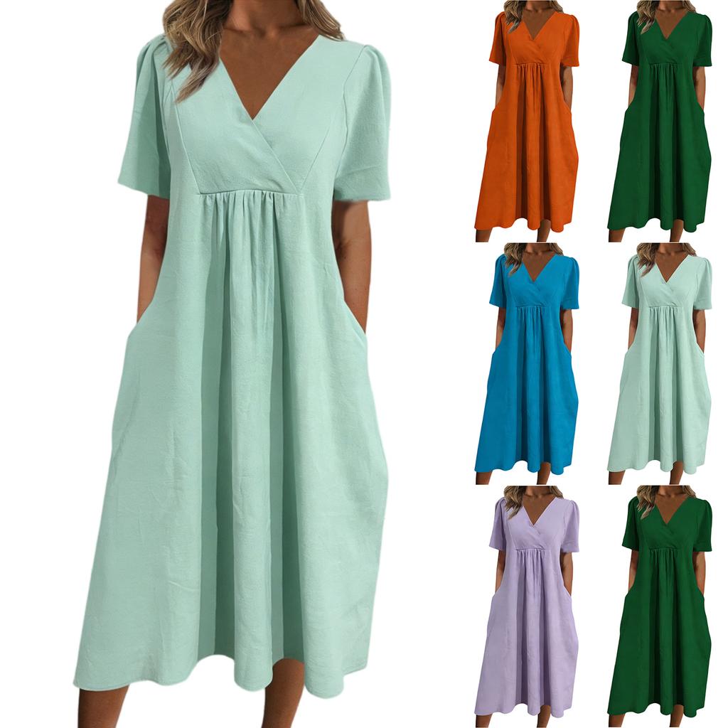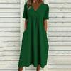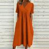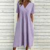 Women's Fashionable Loose-Fit V-Neck Short-Sleeve Casual Cotton-Linen Blend Dress