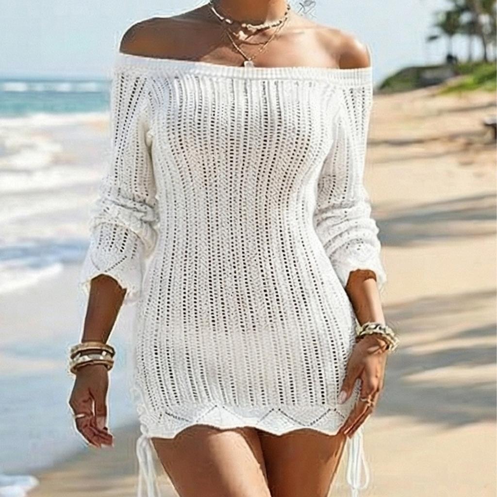 Luxury-lite One-shoulder Knitted Dress, Beach Pure Color Open-back Figure-hugging Dress, Drawstring Fitted Top for Women