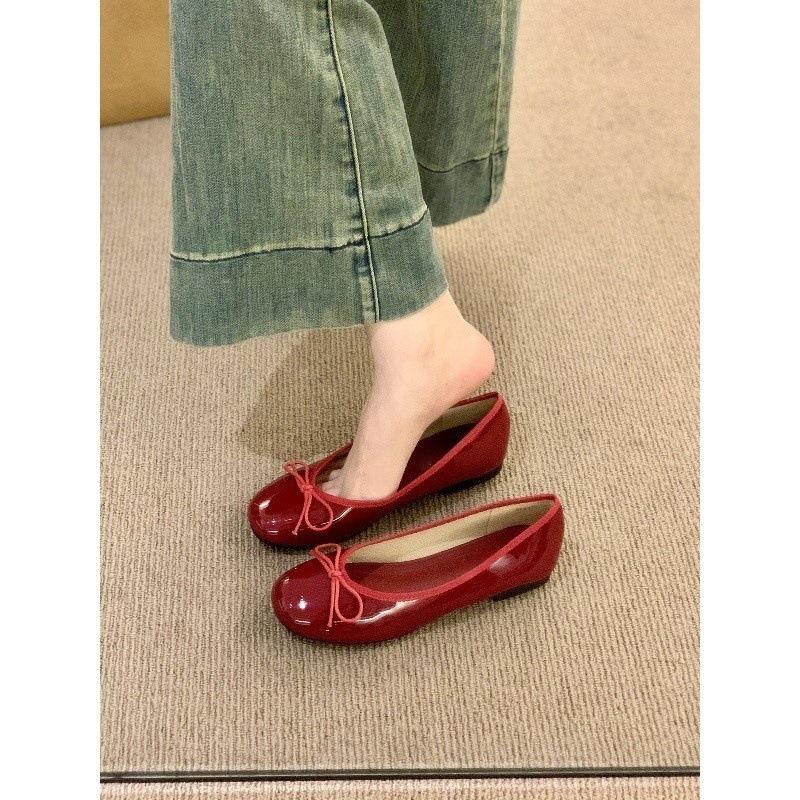 Round Head Patent Leather Single Shoes Summer Bow Flat Bottom Red Shoes Ladyshoes