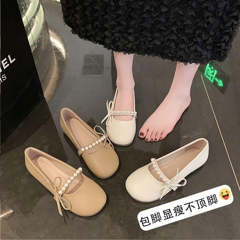 With Beanie Shoes Bridesmaid Shoes Spring and Summer Mary Jane Shoes Women's Shallow Mouth Soft Sole Pearl Premium Skirt