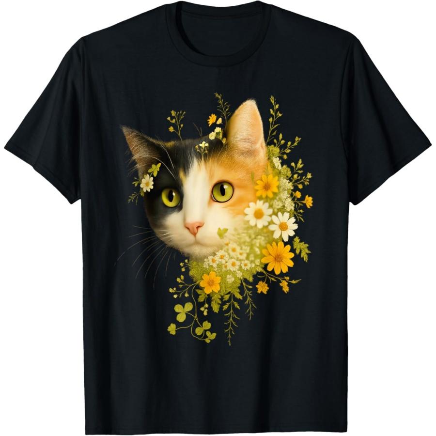 Calico Cat With Flowers for Mom Dad Women Men Kids Botanical T-Shirt(1)