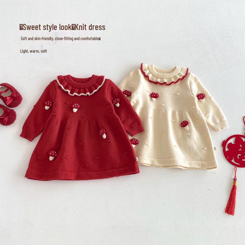 Celebrate special occasions with this charming long-sleeve knit dress crafted from soft acrylic material, perfect for winter festivities. Designed with adorable 3D mushroom accents, this dress makes an ideal outfit for your baby girl's Chinese New Year celebrations or her first birthday. Combining warmth with style, it ensures your little one stays cozy while looking absolutely delightful.