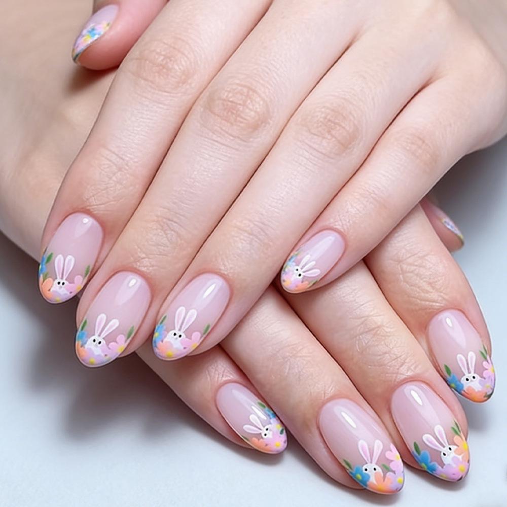 Easter Round Head Cute Rabbit & Flower Nail Art Set - 24 Detachable Glossy False Nails