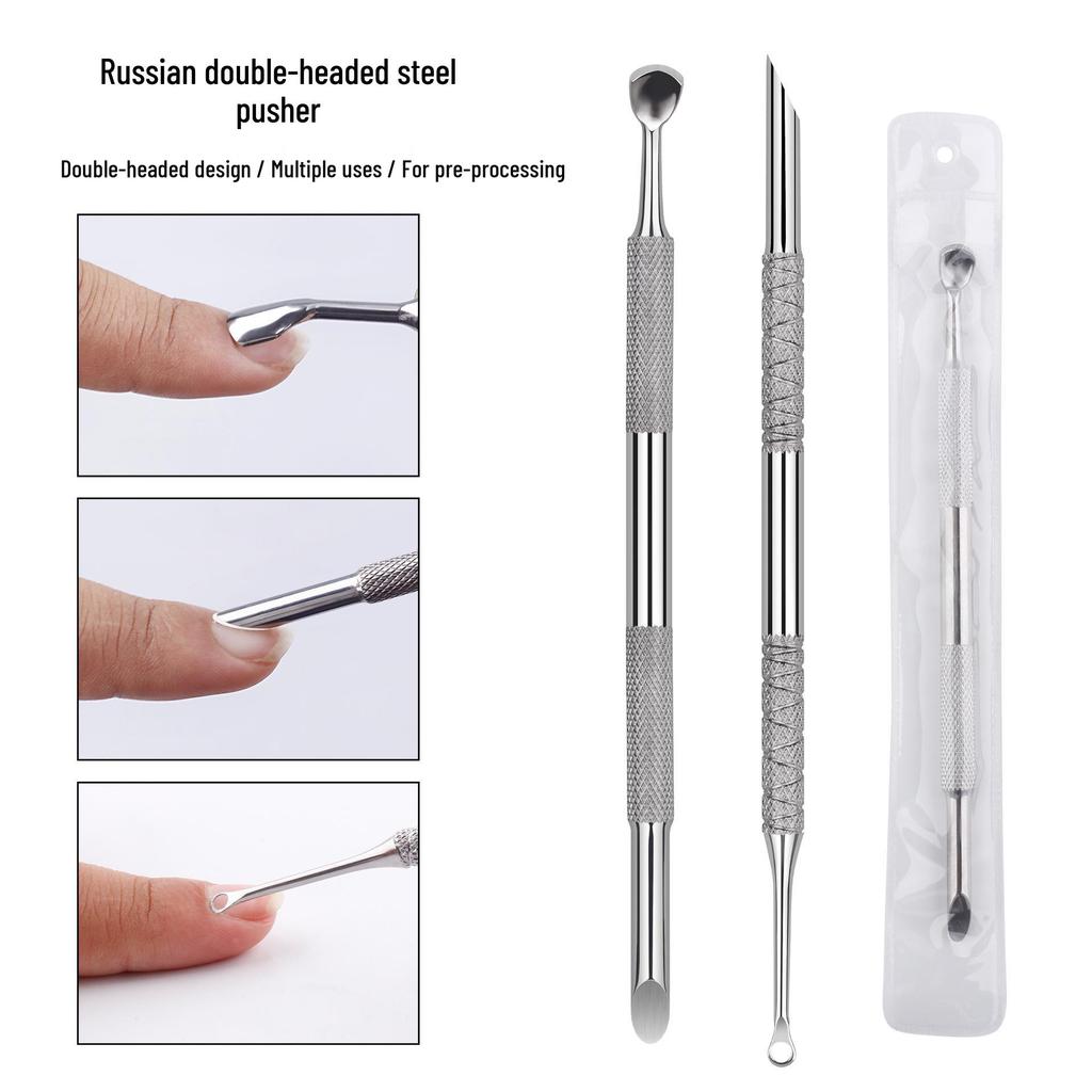 Russian Style Slanted Head Nail Art Tool: Double-Headed Steel Pusher & Gel Remover Stick.