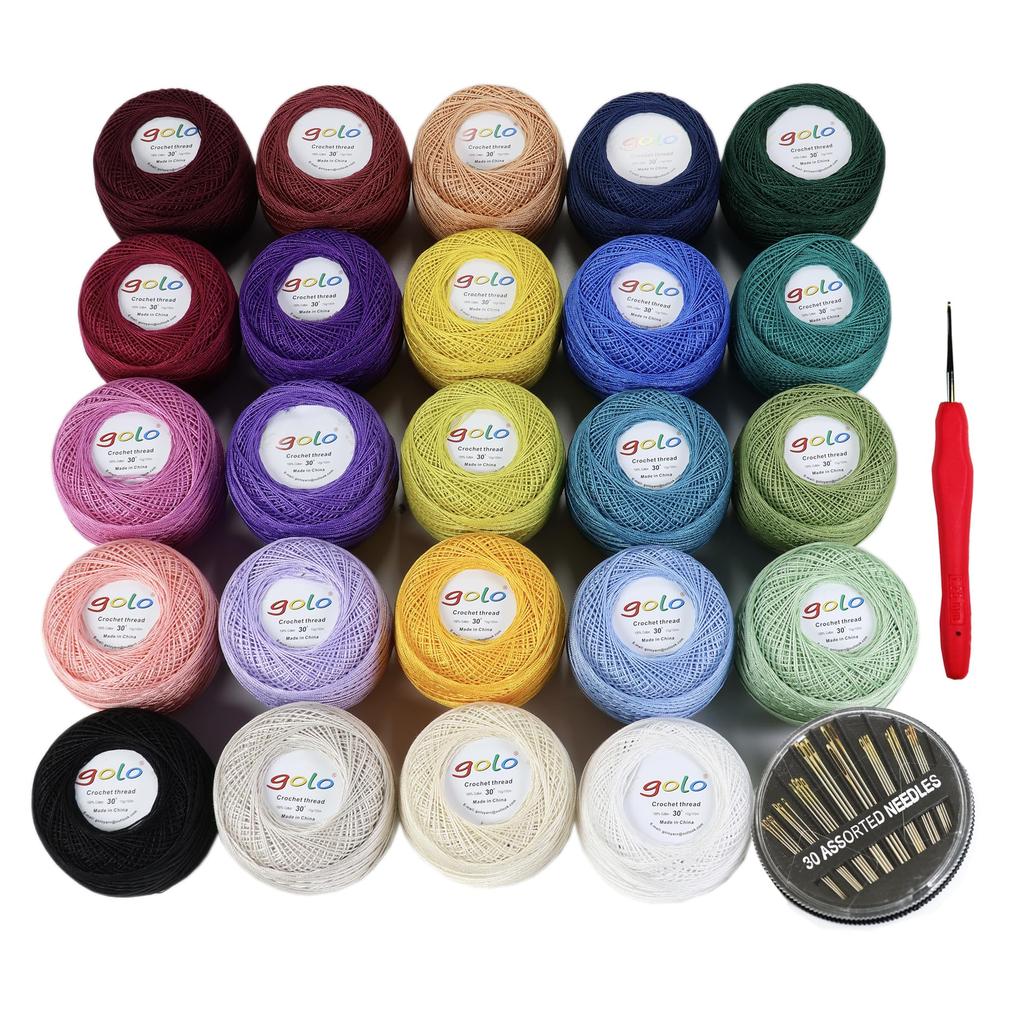 1. This ball of yarn is made of silky, glossy cotton yarn. The colors are vibrant, fade-resistant, and smooth to the touch. Perfect for crafting. 2. The 24-color ball package also includes a hook and 30 sewing needles. 3. Each ball of yarn has a net weight of 10 grams and is approximately 58 meters long.