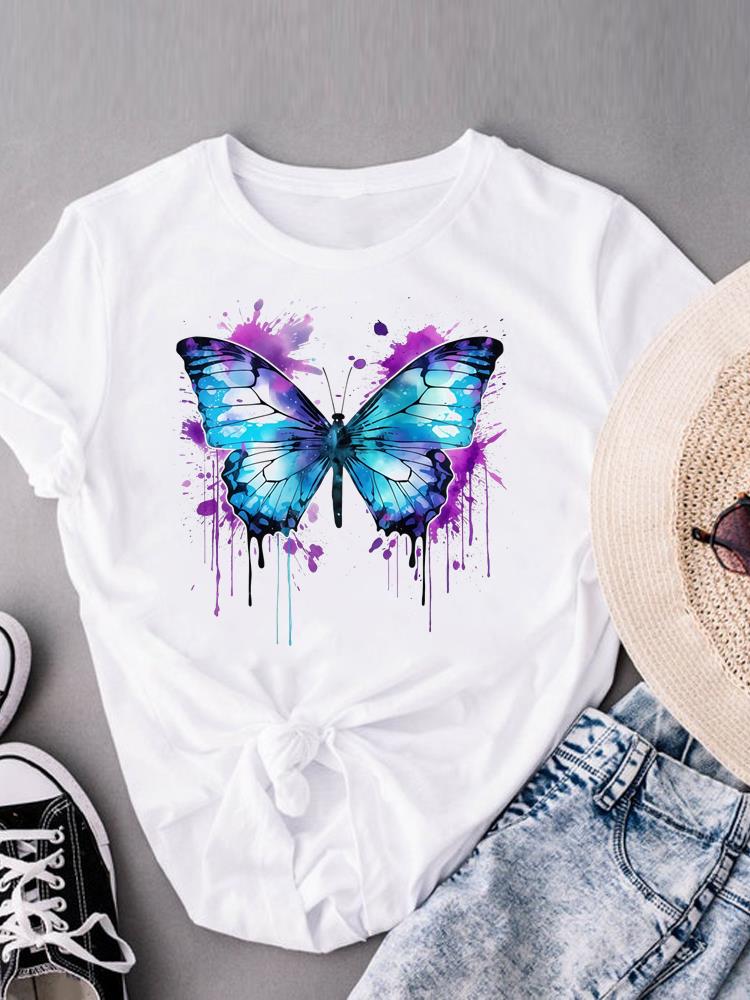 (Asian Size) Watercolor Butterfly Trend Print Casual Top O-neck Short Sleeve T-shirts T Graphic Tee Fashion Female Women's Clothing