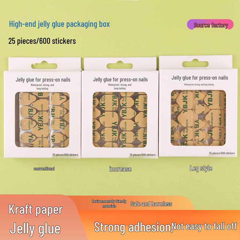 YBJK Boxed Jelly Glue: Upgraded Super Sticky Waterproof Nail Adhesive - 600 Kraft Paper Stickers, 25 Sheets