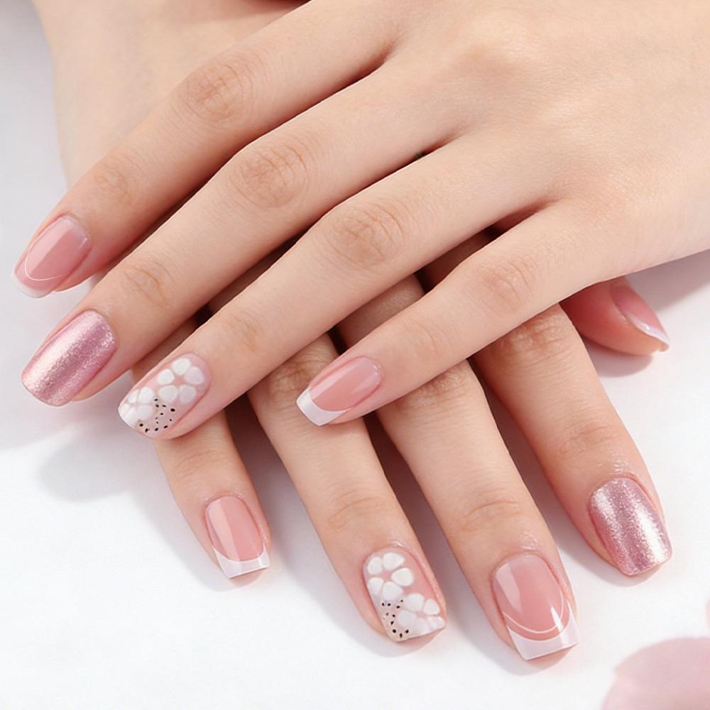 Spring/Summer Pearl Flower Wearable Nails with White French Tips - Bright Surface Manicure Set of 24 Detachable Pieces