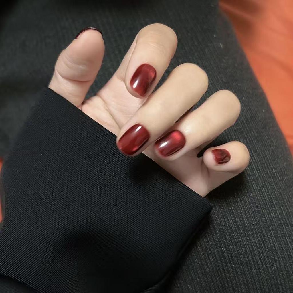 New Year Red Crystal Cat Eye Handmade Short Nail Art Stickers with Glass Beads - Bridal Style