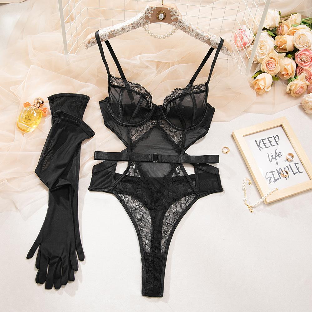 Women’s European and American Sexy Black Lace Sheer Bodysuit, Cut-Out Mesh Shapewear, Erotic One-Piece Lingerie