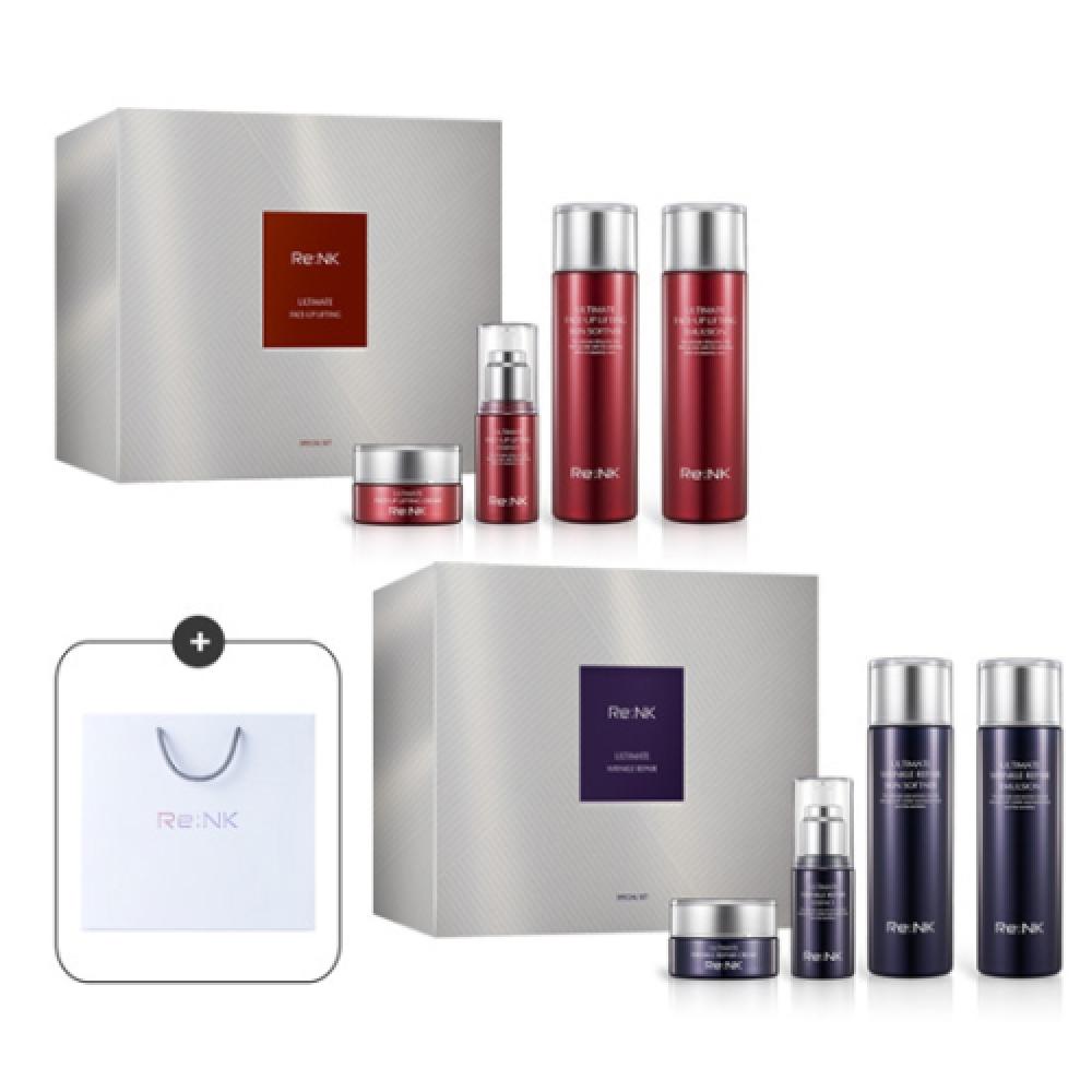 RENK Nourishing/Hydrating Basic Skincare 4-piece Gift Set aims to provide hydration and nutrition to dry and sagging skin while assisting in the improvement of fine lines and skin texture. This product set comprises a toner, emulsion, cream, and essence (or serum).