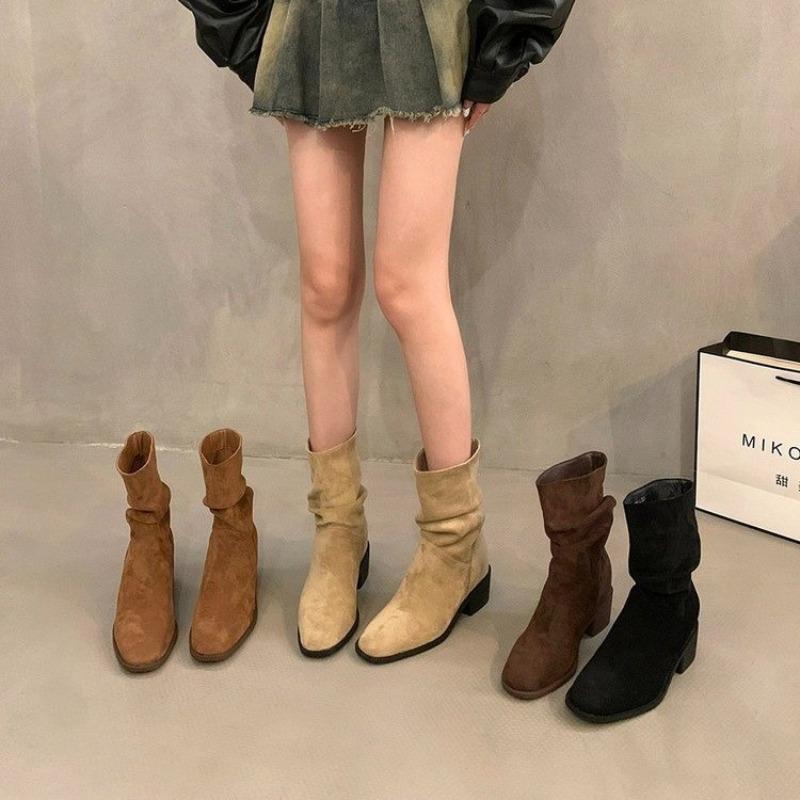 Retro Stacking Boots Women's Summer and Autumn New Thin Khaki Martin Boots Thick Heel Photo Cowboy Short Boots Women