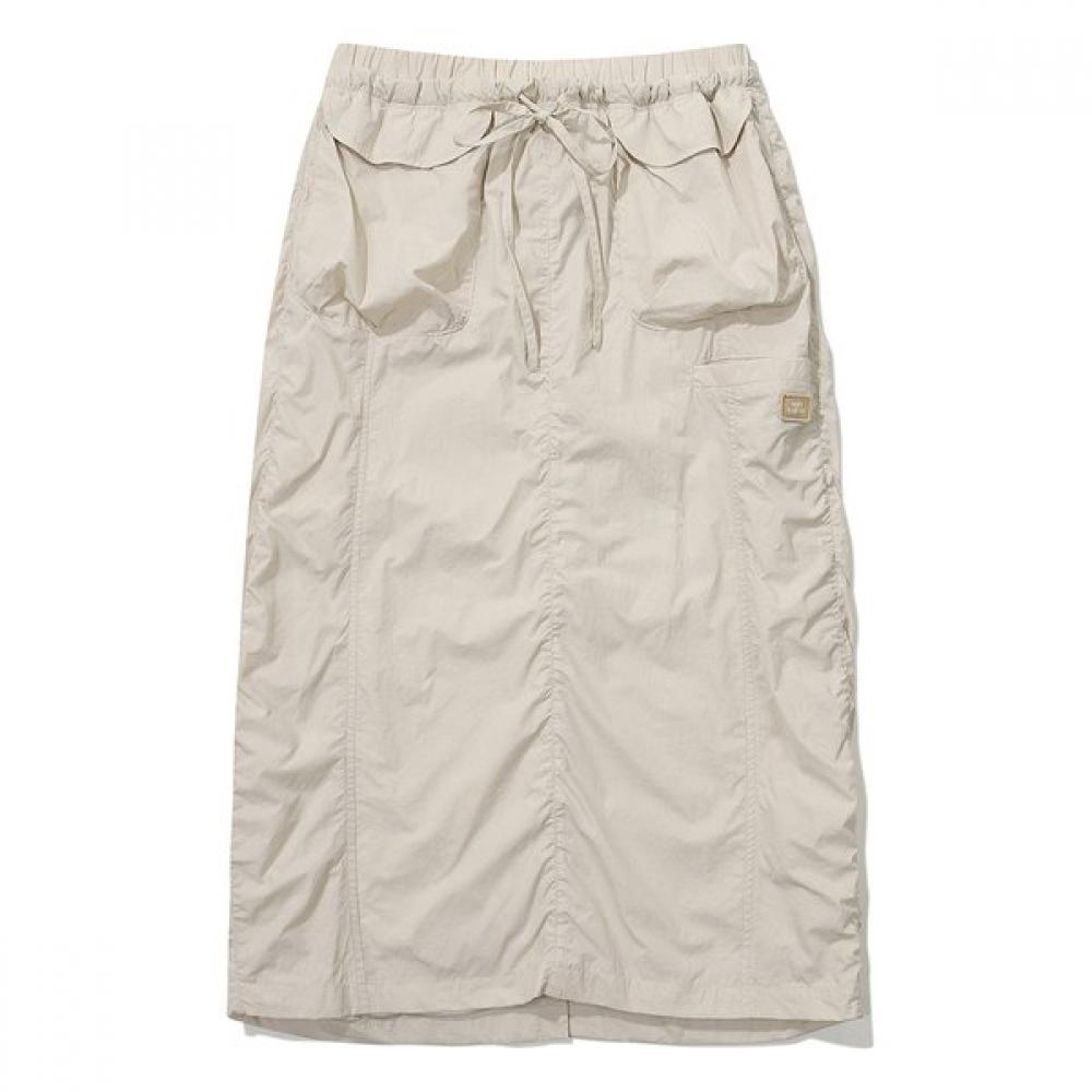 [Worn by Seo Hyun] [24SS] Women's Utility Shirring Skirt is a long skirt featuring a shirring point at the waist in an upper-lower setup. It can be adjusted with a waist string and is suitable for various outdoor activities thanks to its outer pockets. The skirt also features waist and thigh cuts for a slim silhouette.
