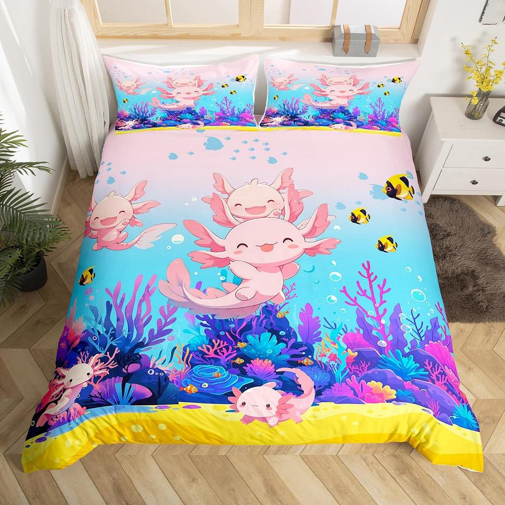Cartoon Axolotl Duvet Cover Queen Twin Size Salamander Bedding Set for Kids Boys Girls Kawaii Sealife Creature Comforter Cover