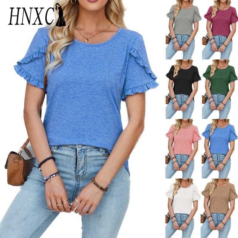 HNXC Women's Fashion Casual Solid Color Print Short Sleeve O Neck Blouses & Shirts