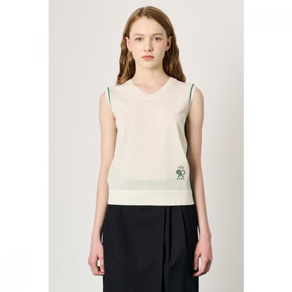 The BCBG Sleeveless Knit Top B3M4K310 features a tennis logo as a focal point. It is crafted with a regular rib structure, characterized by a trendy and feminine round neck style. With a naturally fitting silhouette, it offers high versatility.