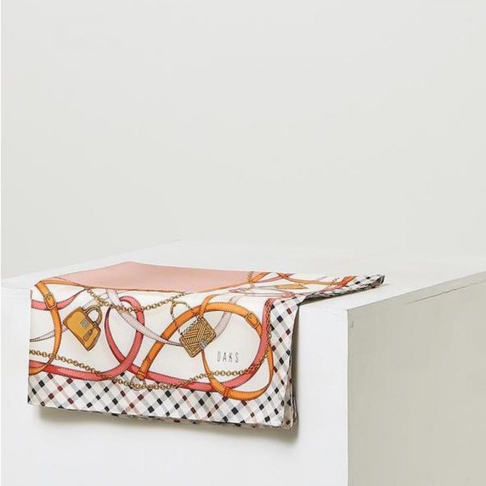 The DAKS Silk Pink Chain Scarf DCSC1F142 is a petite square scarf with luxurious house check borders and a miniature image of a DAKS handbag as a point of interest. Made from 100% silk, it offers a soft and luxurious feel, making it perfect for daily styling with its square shape.