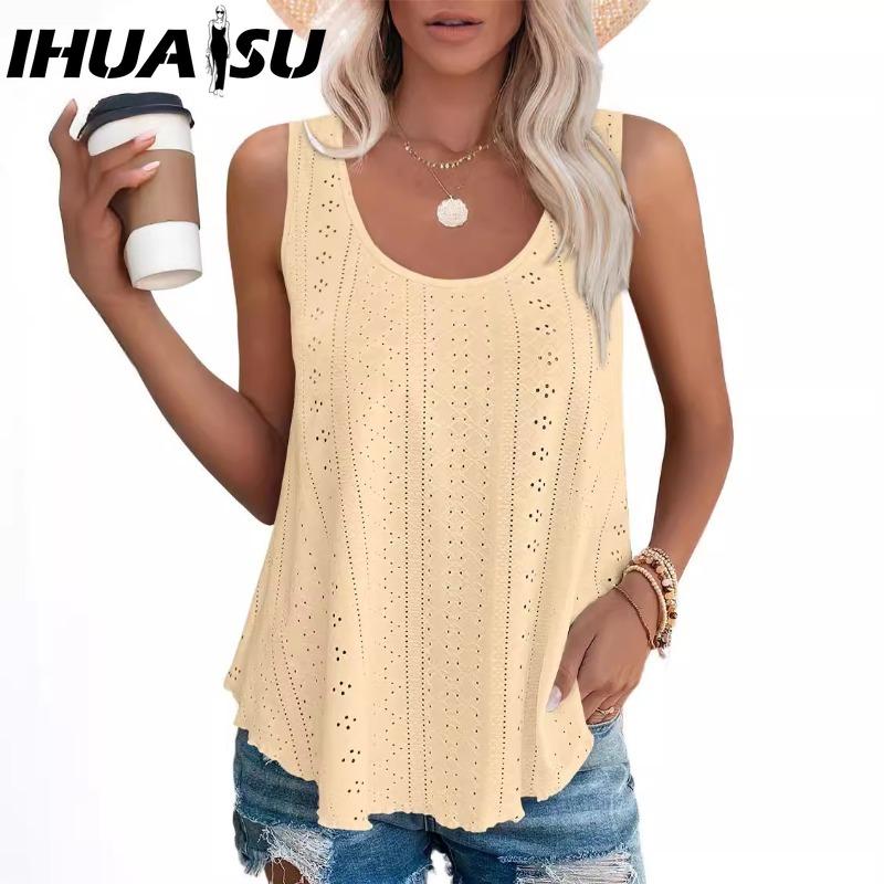 IHUASU Women's Fashion Casual Solid Color Print Sleeveless U Neck Blouses & Shirts