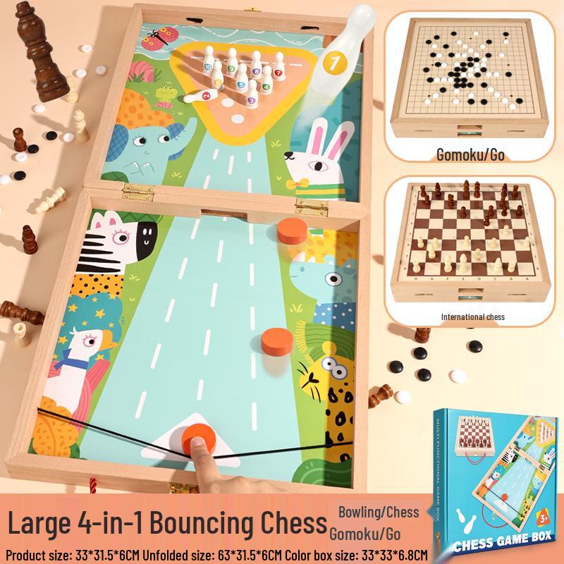 Double-Sided 4-in-1 Wooden Game Set: Chess, Five-in-a-Row, Go, Bowling - Children's Educational Toy