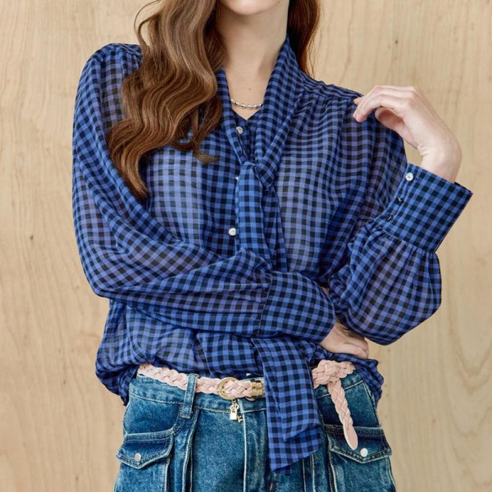 The Check Tie Ribbon Chiffon Blouse ZD09QB600ON features an elegant design with a tie detail along the neckline. Its sheer material creates a feminine vibe, making it easy to coordinate with a range of items stylishly.