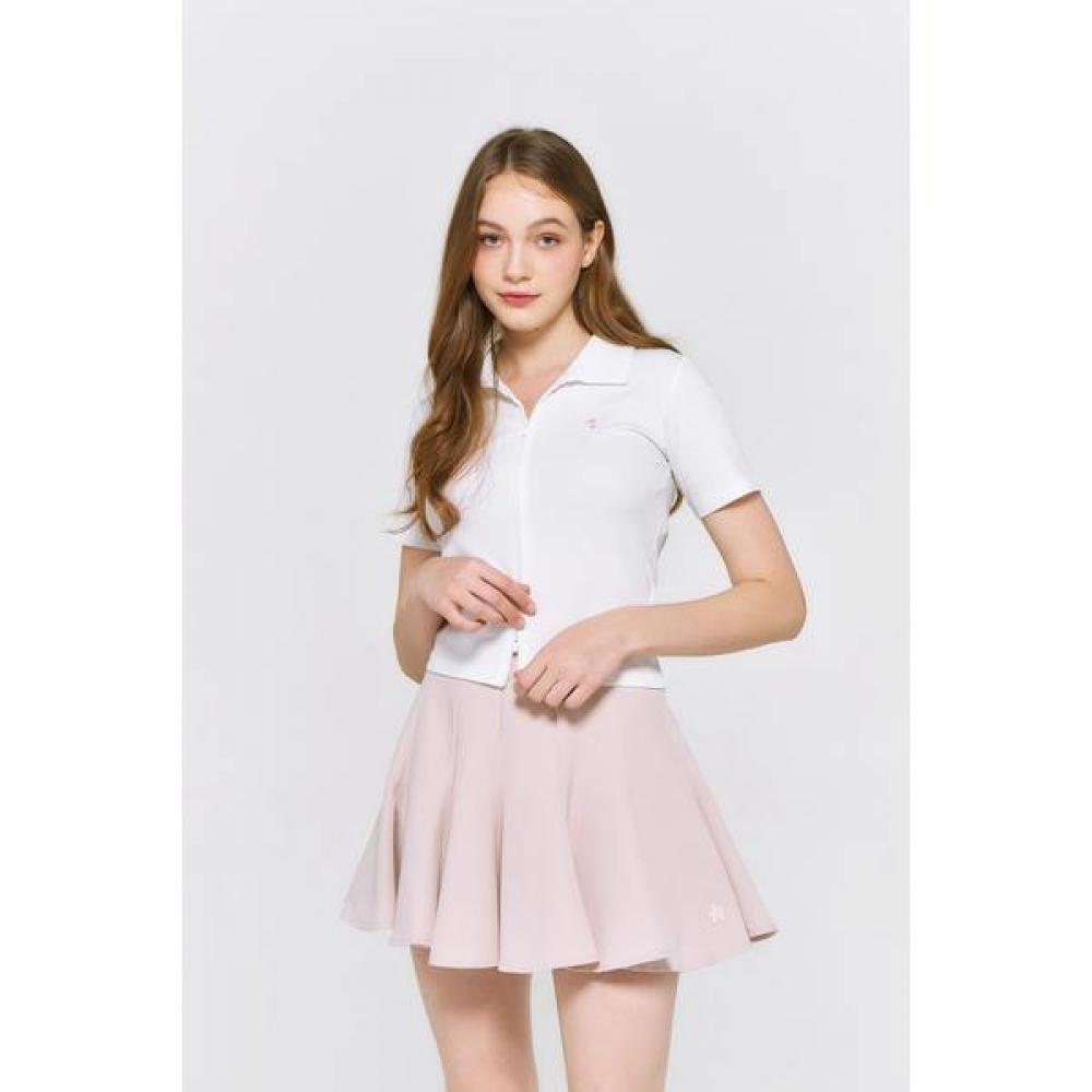 The GoEXO White Ribbed Collar Short Zip-Up (Rat Flower) features a modern collar neck design with a two-way zipper, allowing for a premium touch. The semi-crop length pairs well with skirts or pants, and the ribbed texture creates a feminine silhouette. The white color provides a refreshing and beautiful impression.