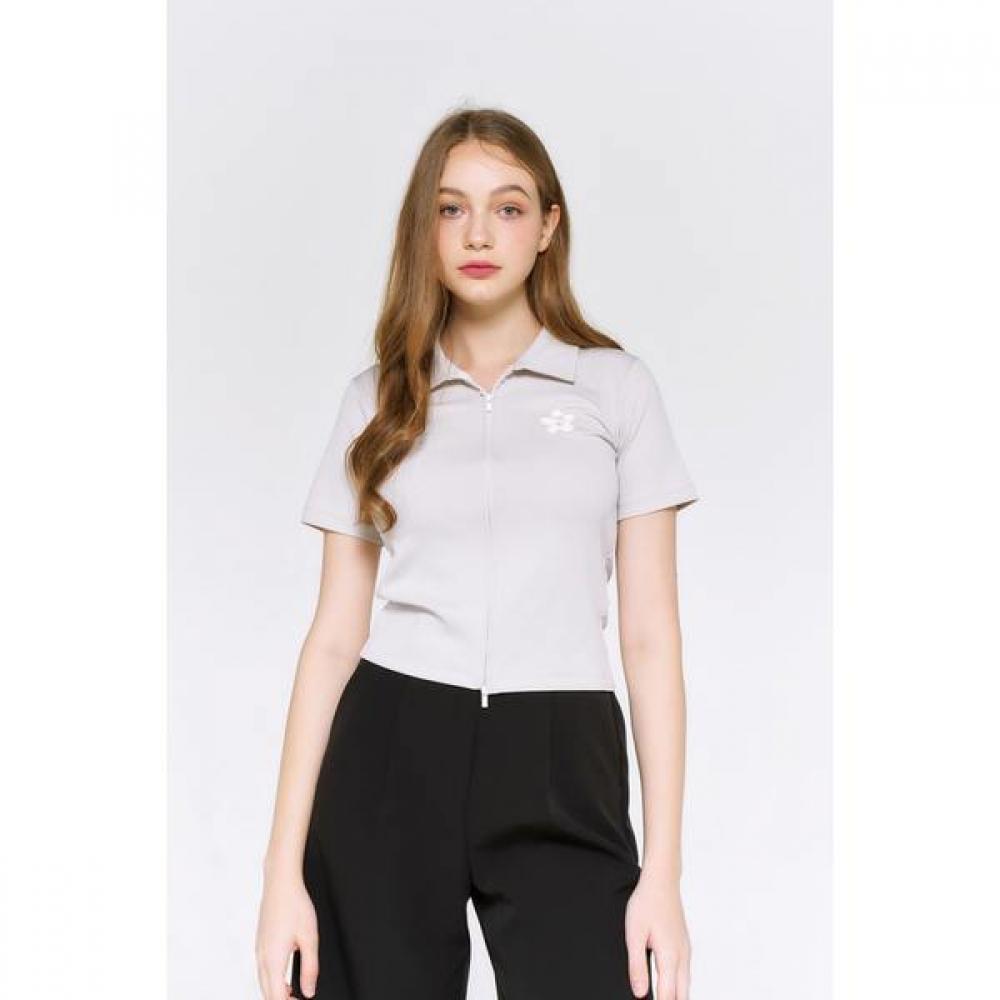 The Goxo G-Flower Ribbed Collar Short Zip-Up in Beige is a women's golf apparel with a ribbed design and a two-way zipper. Its semi-crop length makes it easy to style with skirts or pants, highlighting a feminine silhouette.