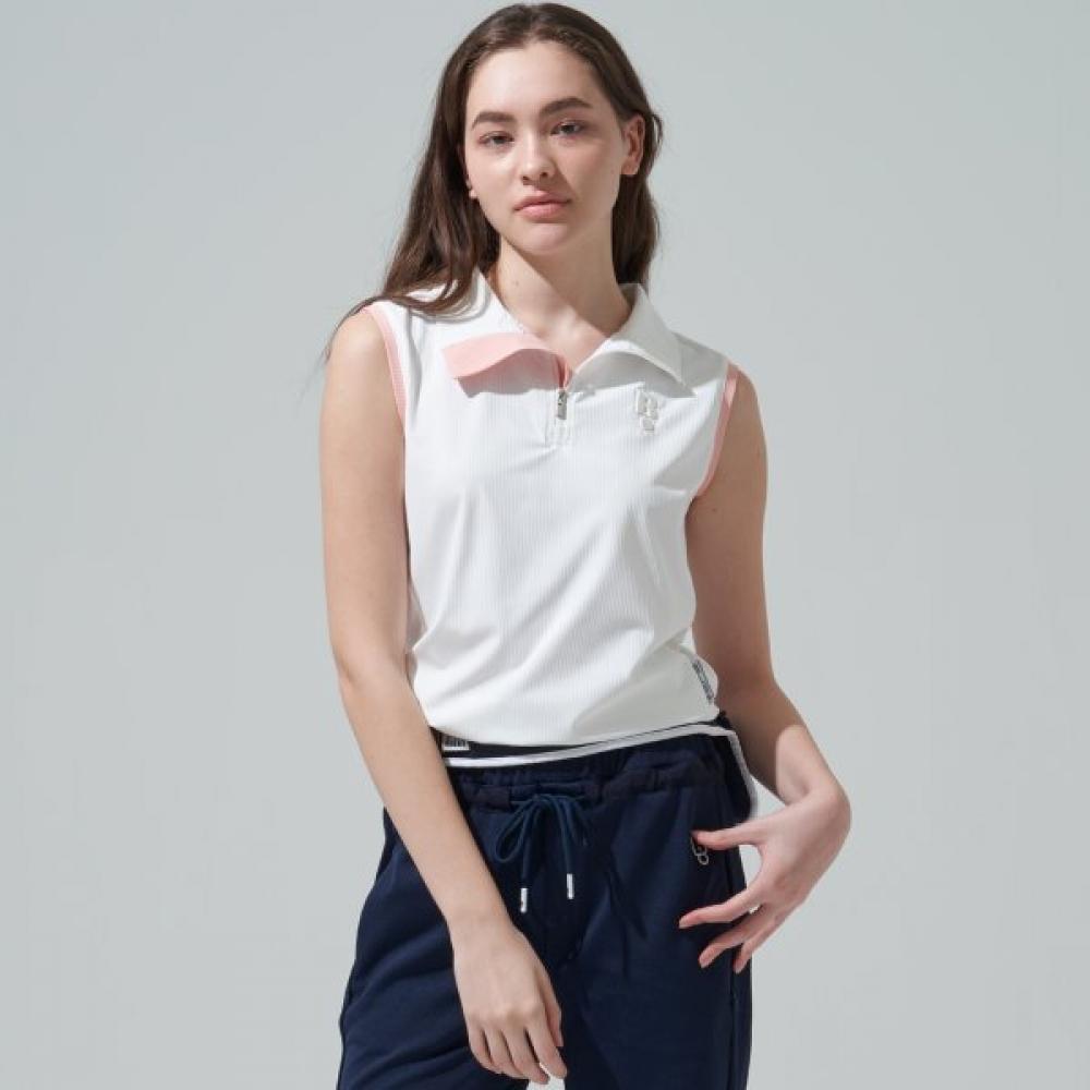 The BLUDOT Colorblock Sleeveless T-Shirt_OW belongs to the women's golf apparel category and features a sleeveless design. Equipped with cooling touch technology, it maintains comfort while providing excellent UV protection. With moisture-wicking capabilities and outstanding stretch, it is optimized for spring and summer golf rounds. A design highlight is the color accent on the left chest area.