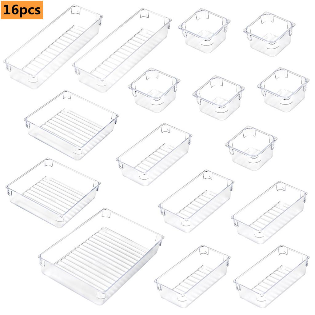 16pcs Drawer Organizer Set Transparent Office Desk Drawer Dividers Trays Dresser Storage Bins Separation Box