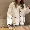 Women's Korean Style Lambswool Color Block Coat: Loose Fit, Contrast Stitching, Round Neck, Button Cardigan with Pockets, Long Sleeves.