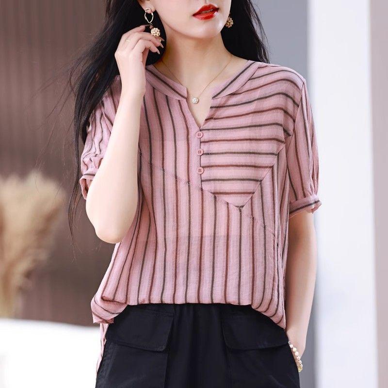 Striped Short-sleeved Shirt for Women's New V-neck Chiffon Top Summer Clothes Mother's Fashionable and Fashionable Casual Shirt