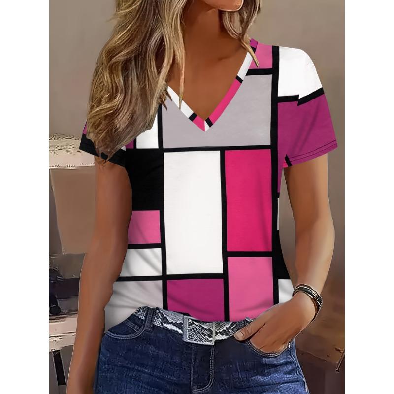 Geometric Grid Full Print V-neck Short Sleeved T-shirt for Casual Summer Women's Wear