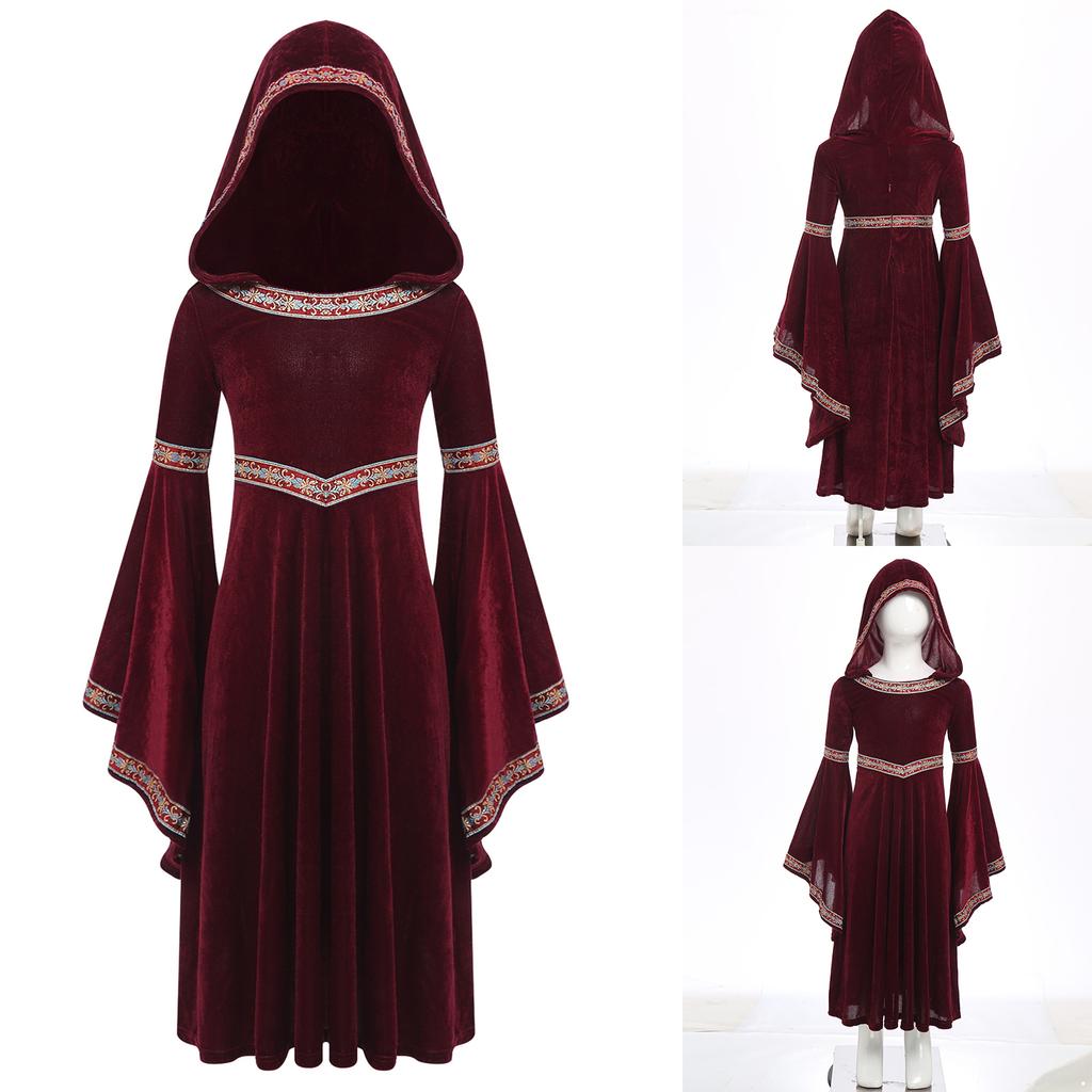 Medieval Princess Halloween Costume for Girls: Hooded Velvet Robe with Embroidered Trim & Elegant Long Trumpet Sleeves